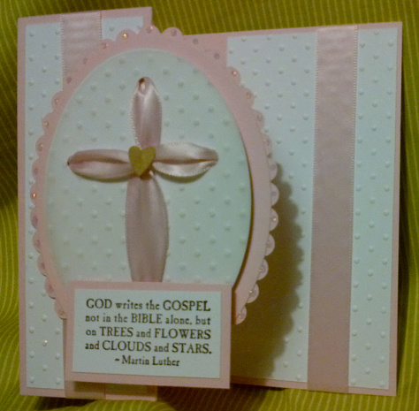 This is a special card for a friend of a friend! Her little girl will be having her First Communion very soon, and I designed this card in her honour. It is a 'Z' fold card made by folding the front of the card back on itself - score first! The cardstock is from Stampin' Up!, Whisper White, Pink Pirouette and the layer right under the ribbon cross is vellum which was embossed with a dot folder, as were the white background pieces. I used Spellbinders Scallop and plain ovals to die cut the large medallion. To make the ribbon cross, draw cross shape on the back of the white oval, not the vellum, and punch 1/4" holes at the tips with a hand held punch. Thread ribbon through the holes and attach to the back of the oval. Using matching thread tie a knot in the center of the cross to gather the ribbon, then adhere a punched gold heart. The sentiment is stamped in Chocolate Chip ink and is from SU! Le Garden Botinique, but you could always print a nice sentiment using the computer. I added Stickles to the ruffle around the oval, but paper piercing would be pretty too!! I attached the mediallion to the card with Tombow, but you could use velcro dots, then the recipient would have a removable memento of the special day!